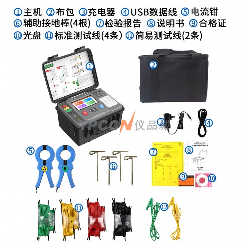 仪表: 2430g(含电池) 电流钳:940g(2把) 测试线:1300g(含简易测试线) 辅助接地棒: 850g(4根) |